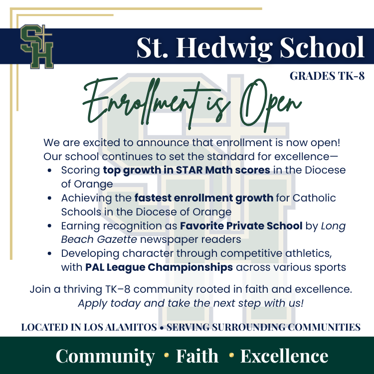 “I feel incredibly blessed to have spent my entire elementary and middle school years at St. Hedwig School, from kindergarten through 8th grade. The strong Catholic education I received here, rooted in faith, tradition, and values, gave me a foundation that has guided me throughout my life. St. Hedwig not only prepared me spiritually, but also academically. It set me up for success in high school and helped me go on to earn my Bachelor’s Degree in Criminal Justice from Chapman University.